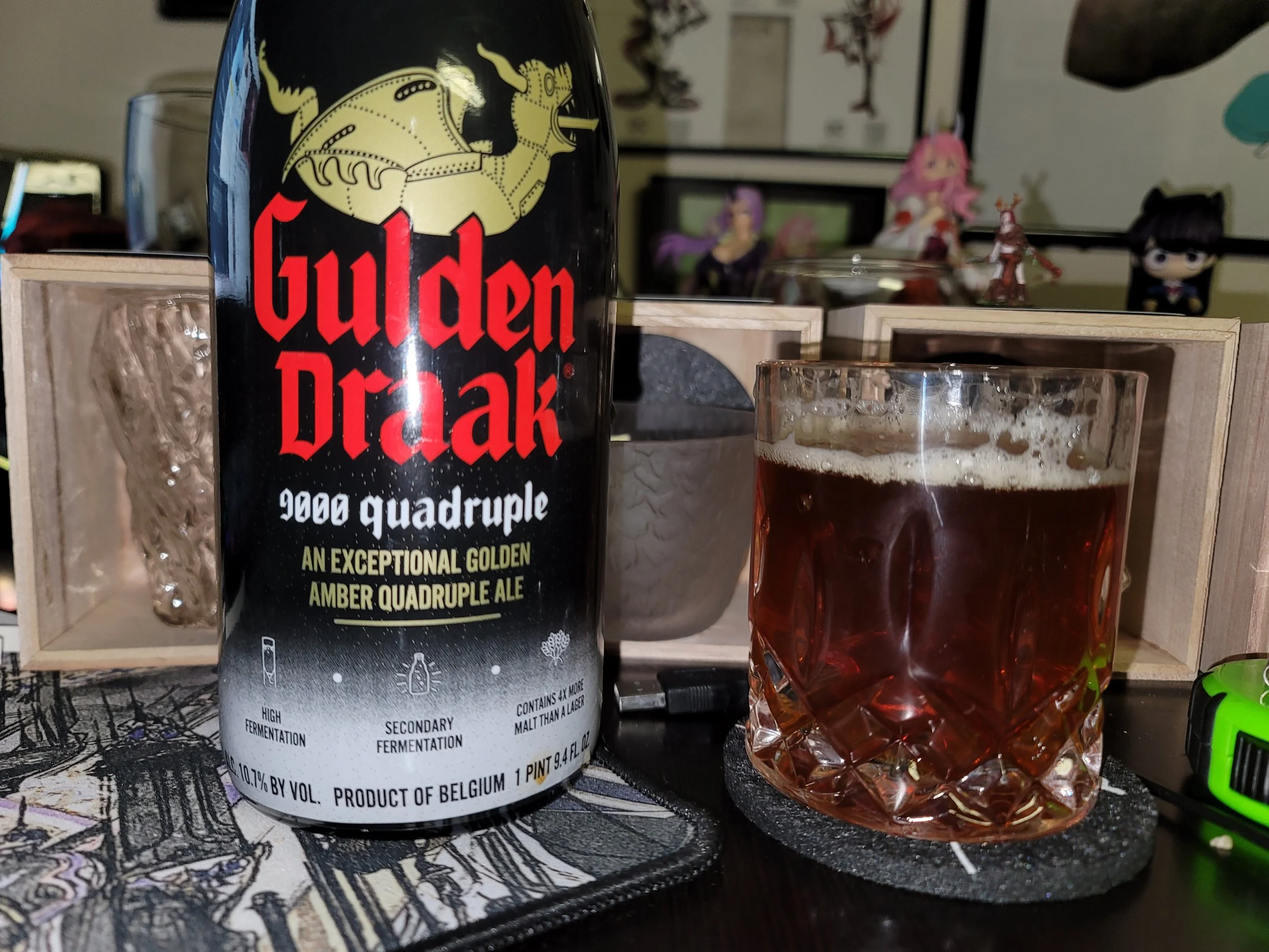 Behold a small taste of the cluttered landscape of my desk. You can see 4 of my 5 whisky glasses (From Kori Whiskey they are great glasses), you can also see a little bit of my nerdy stuff. I took this picture to demonstrate just how large this bottle is. This bottle is a foot tall, and contains 25.4 oz. An odd number of ounces, but meh. This one bottle contains about as much as the 4 cans from Hoppin’ Frog. You can’t see very well in this picture, but this bottle comes in at a hefty 10.7% ABV, which coming in next to Hoppin Frog actually seems a little light.